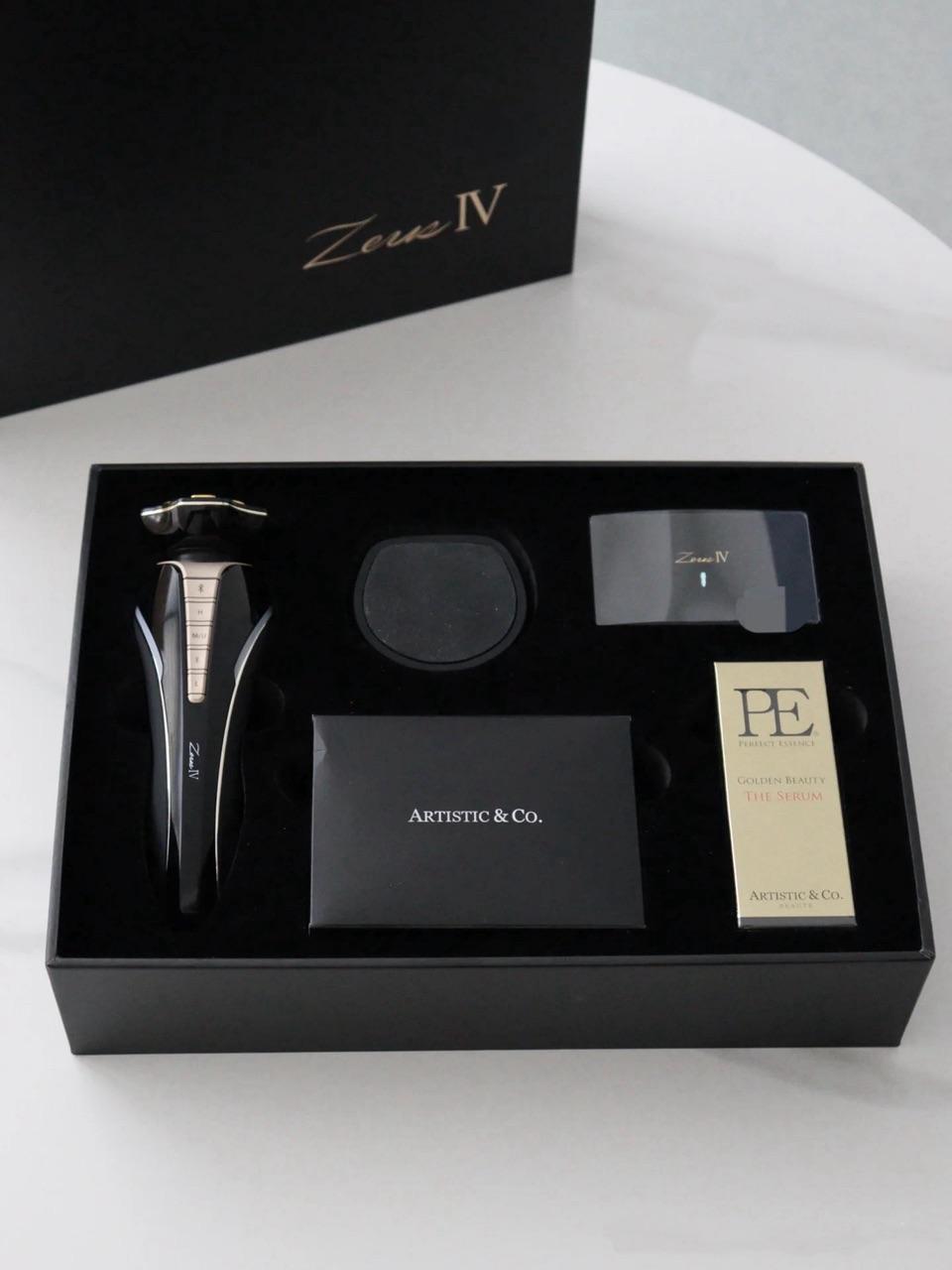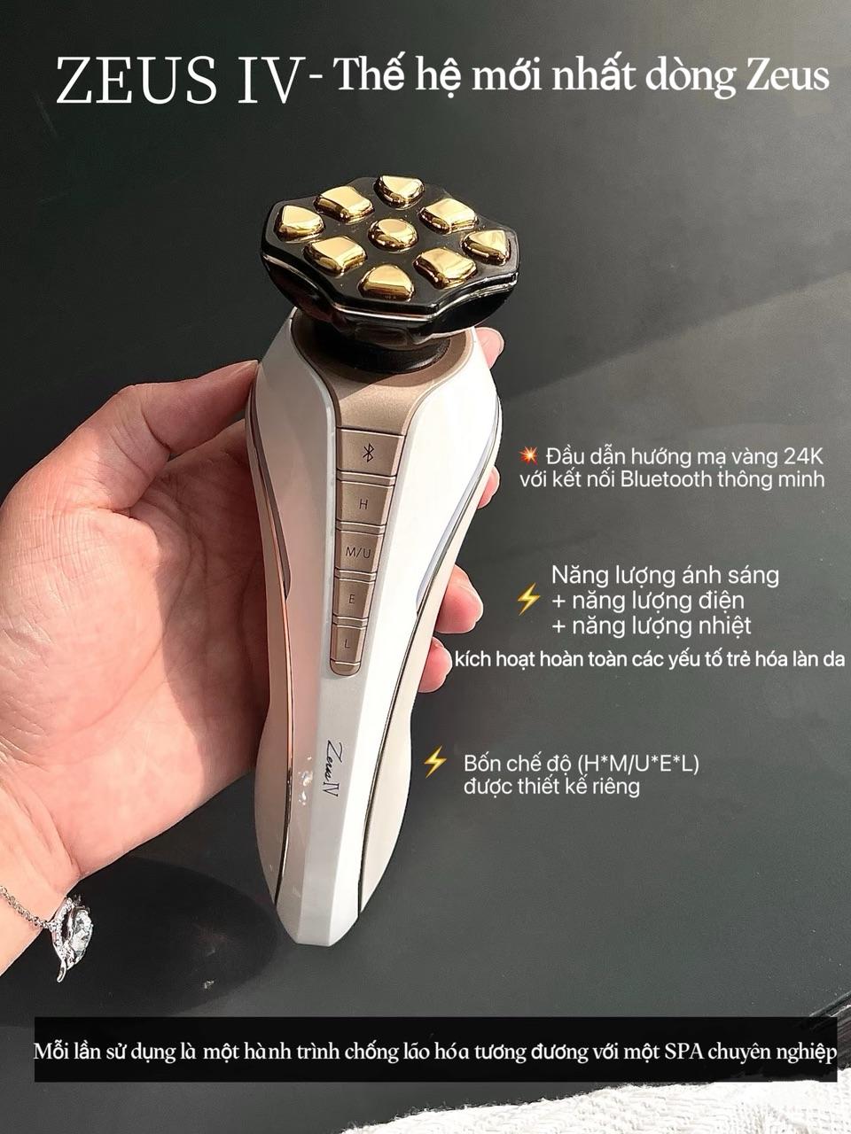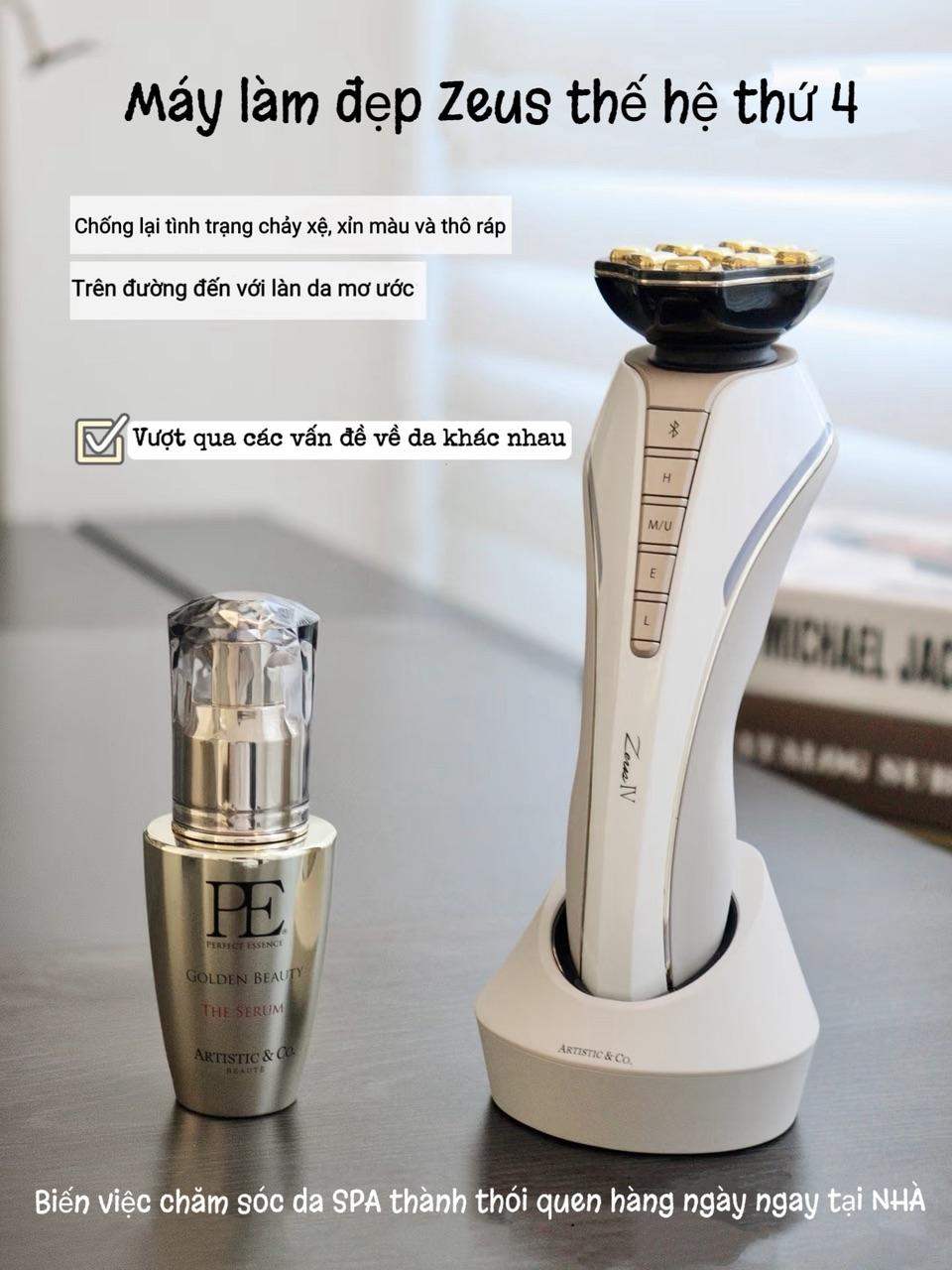 - Bộ sản phẩm bao gồm: Thiết bị Zeus IV, bộ sạc & chân đế, thẻ bảo hành, thẻ đăng ký người dùng, Serum PE Golden Beauty 40 ml.