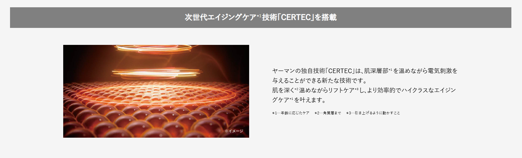 YA-MAN đã phát triển công nghệ độc quyền “CERTEC”, giúp cung cấp kích thích điện nhẹ trong khi làm ấm các lớp sâu của da (*tới lớp sừng).