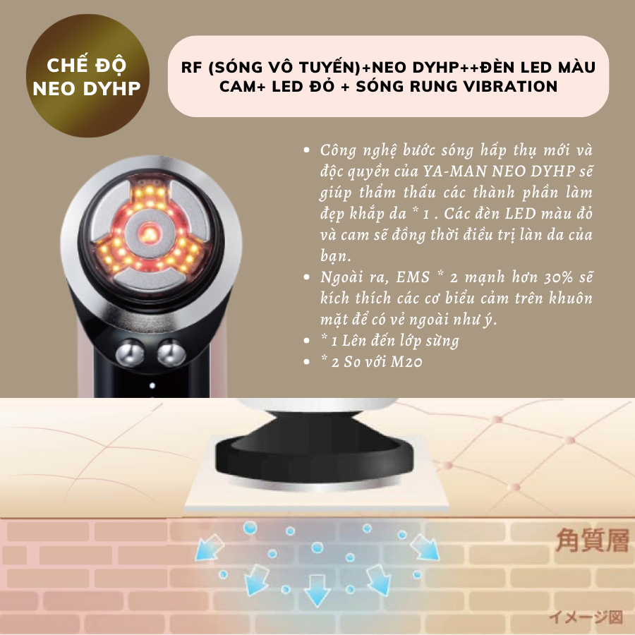 Chế độ NEO DYHP (RF, NEODYHP, LED đỏ, LED cam, rung). Yaman M30 trang bị dạng sóng độc đáo mới - được giới thiệu là công nghệ "NEO DYHP". Thẩm thấu các thành phần làm đẹp vào mọi ngóc ngách của lớp sừng. Ngoài ra còn có các phương pháp điều trị bằng đèn LED với các màu đỏ và cam. Đặc biệt, "chế độ EMS" được cải tiến làm tăng 30% hiệu quả nâng cơ cơ trên khuôn mặt so với đời máy M20 trước đó