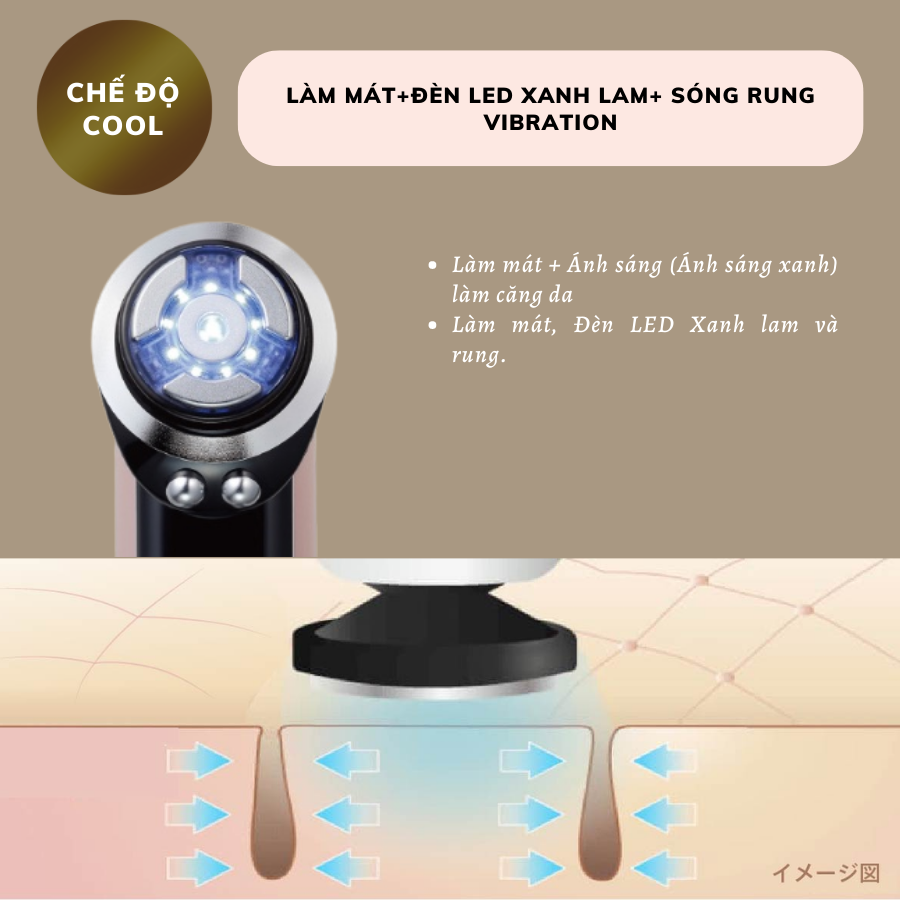 Chế độ LÀM MÁT: hay còn gọi là làm lạnh, se khít lỗ chân lông, bước này nhiệt độ được hạ xuống giúp khóa ẩm lại các dưỡng chất đã thẩm thấu lúc nãy giờ, đồng thời tích hợp Led Xanh dương giúp tiêu diệt các vi khuẩn gây mụn