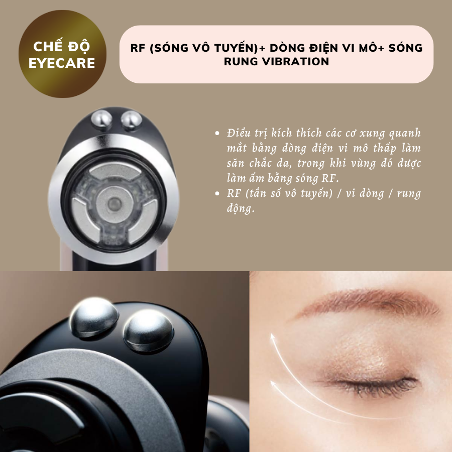 Chế độ EyeCare - CHĂM SÓC MẮT: Công nghệ được sử dụng ở đây là RF, EMS chuyên dụng cho mắt, dòng điện siêu nhỏ (hay còn gọi là sóng Micrrocurennt mà mọi người bắt gặp ở Refa đó nè). Vùng mắt là vùng dễ lão hóa, nên bước này cực quan trọng nha, nếu chăm chỉ sử dụng, bước này sẽ giúp xóa vết nhăn luôn đó