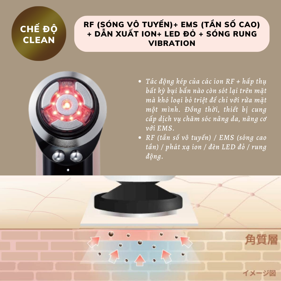 Chế độ Làm sạch sâu: Công nghệ được sử dụng ở đây là RF và Ion+:Với phương pháp tiếp cận kép của các ion + RF, giúp hấp thụ bụi bẩn không thể loại bỏ bằng cách rửa mặt thông thường 1 cách dễ dàng
