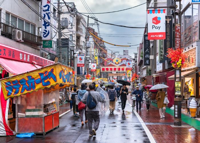 Ameyoko bắt nguồn từ chợ đồ Mỹ sau Thế chiến II, nay đã trở thành phố mua sắm nhộn nhịp với hơn 400 cửa hàng. Bạn có thể mua từ hải sản tươi sống, đồ khô, mỹ phẩm, quần áo cho tới bánh kẹo Nhật Bản tại Niki no Kashi. Ngoài ra, nơi đây còn nổi tiếng với ẩm thực quốc tế giá rẻ như tiểu long bao chiên, gà nướng Thổ Nhĩ Kỳ.