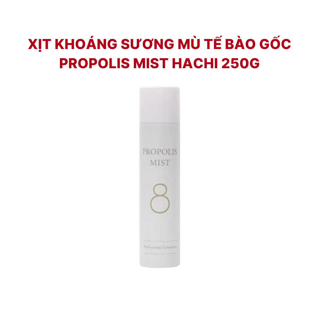 Xịt khoáng sương mù sáp ong bổ sung tế bào gốc Propolis Mist Hachi là sản phẩm chăm sóc da tiện lợi, giúp cấp ẩm tức thì và làm dịu da. Với thành phần chính là chiết xuất sáp ong và propolis, sản phẩm giúp làm mềm mịn da, se khít lỗ chân lông và hỗ trợ làm lành các tổn thương nhỏ trên da. Kết cấu dạng sương mù siêu mịn, thẩm thấu nhanh, không gây nhờn rít. Sản phẩm có thể sử dụng mọi lúc mọi nơi, giúp làm dịu da khi bị cháy nắng, khô ráp hoặc sau khi trang điểm. Propolis Mist Hachi là sự lựa chọn hoàn hảo cho làn da khô, nhạy cảm hoặc bị tổn thương.
